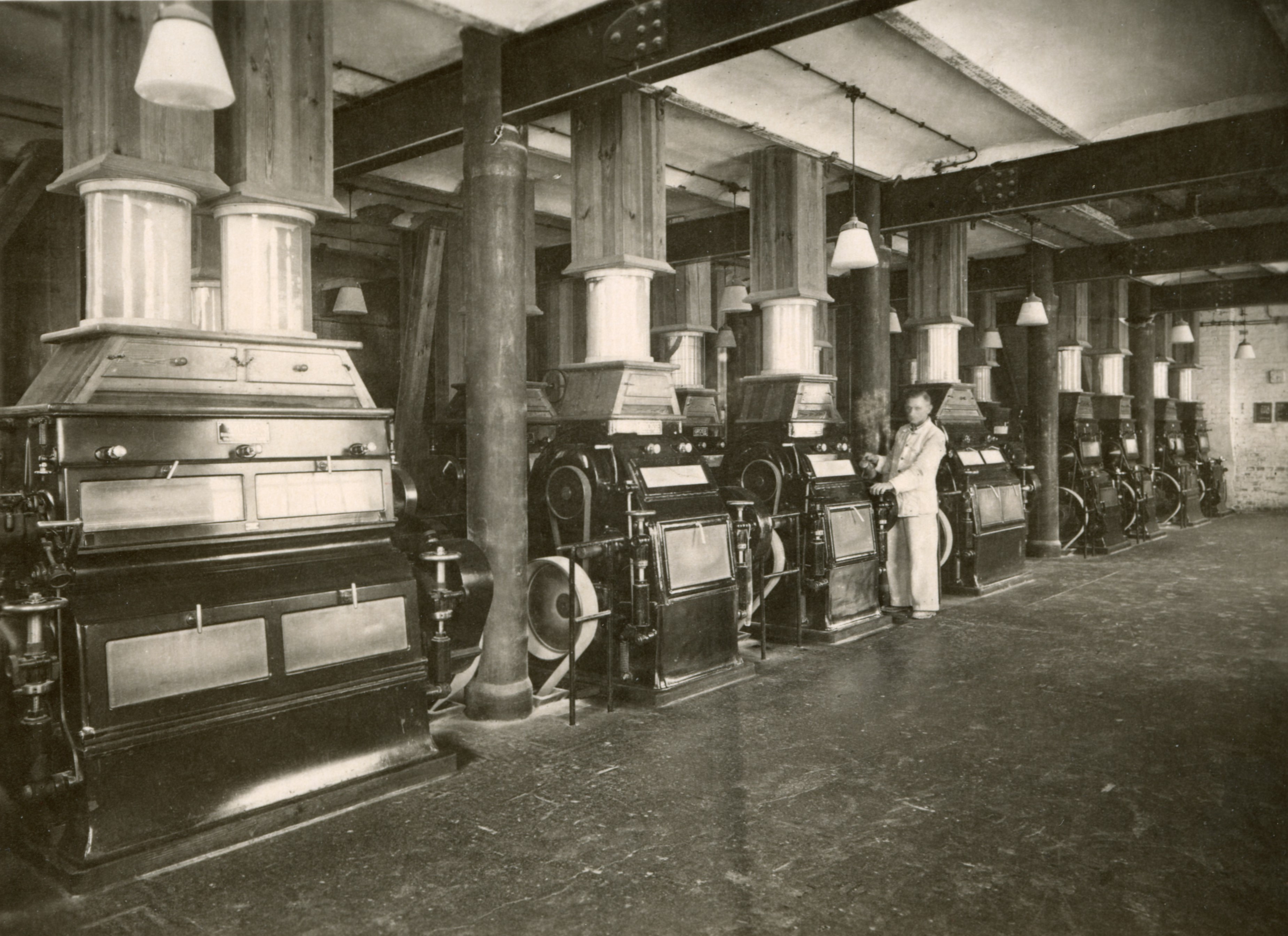 Zwei große Stahlwalzen in Walzstühlen zerrieben die Getreidekörner. Anschließend wurden sie gesiebt. Dabei wurden die Körner der Größe nach sortiert und getrennt. Das dabei bereits anfallende Mehl wurde herausgesiebt.